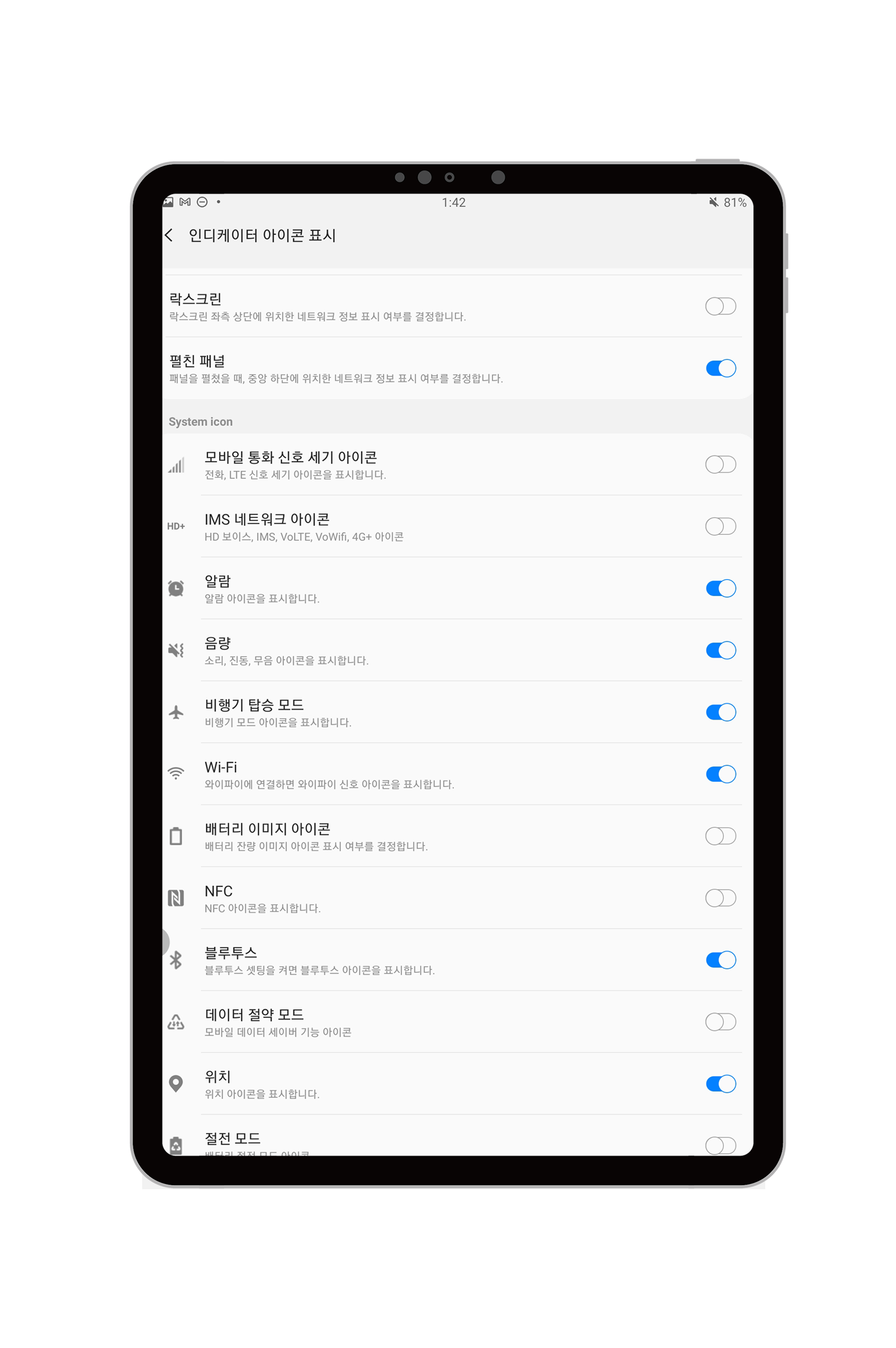 인디케이터 아이콘 표시에서, 원하는 상태표시줄 아이콘을 선택하여 켜고 끌 수 있습니다.