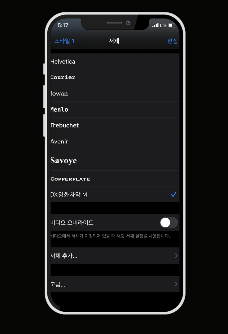 텍스트란의 서체 클릭 - 세번째 사진의 아래 서체 추가 클릭 - DX영화자막 M 추가,
